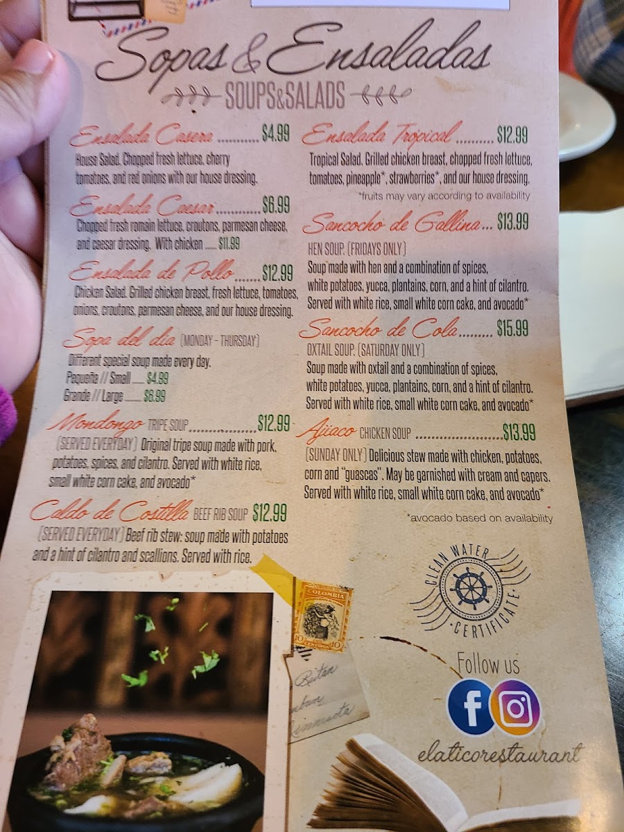 Sopa hecha con gallina y una combinación de especias, papas blancas, yuca, plátanos, maíz y un toque de cilantro. Servido con arroz blanco, una arepa blanca pequeña y aguacate. / Soup made with hen and a combination of spices, white potatoes, cassava, plantains, corn, and a hint of cilantro. Served with white rice, a small white corn cake, and avocado.